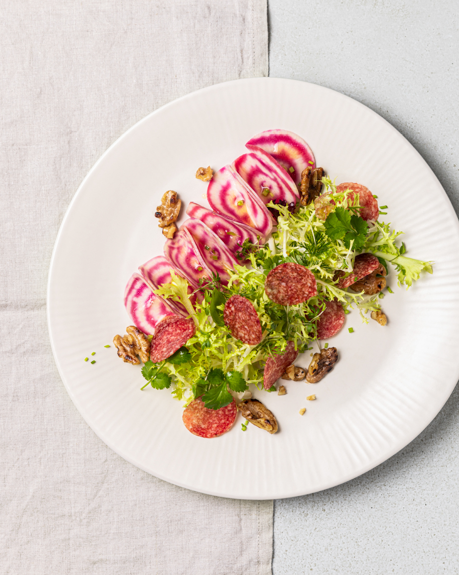 Ein perfektes Match mit dem Frühling ist auch die venezianische Chioggia-Rübe. Aufgeschnitten zeigt sie ihr wunderschönes rot-weißes Ringmuster. Wir kombinieren sie mit frischen Gartenkräutern und unserer Jägersalami – eine überraschende, aber perfekt abgestimmte Kombination.