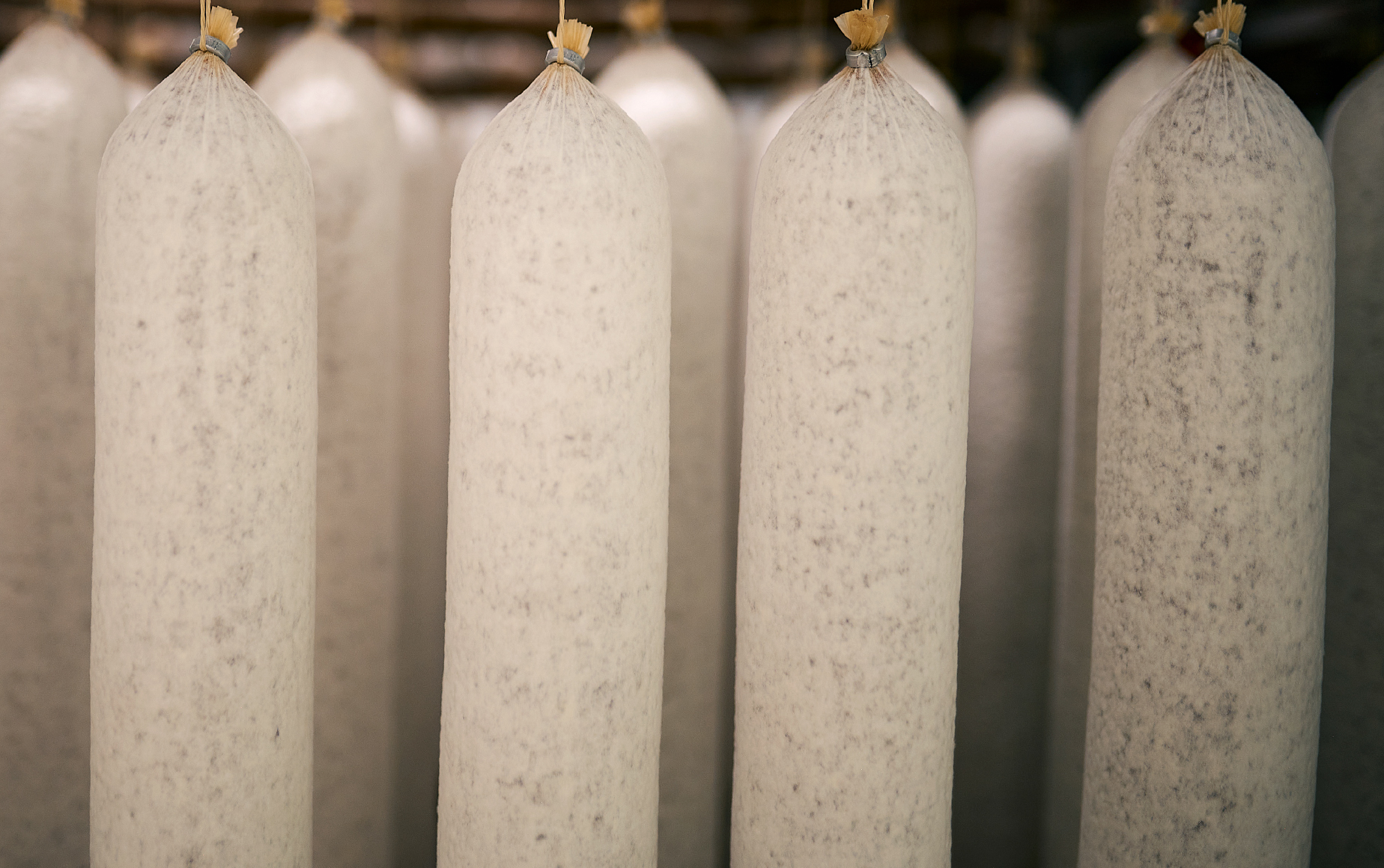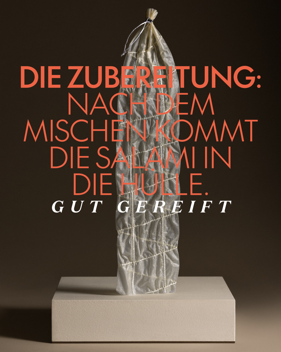 Nach dem Mischen kommt die Salami in Wursthüllen. Damit auch außen alles gut reift, wird die Salami mit Edelschimmel-Kulturen angereichert. Innen sorgen die Starterkulturen für eine stabile Reifung, während der Edelschimmel außen einen Mantel bildet, in dem Aroma und Oberfläche ruhig und kontrolliert entstehen können.